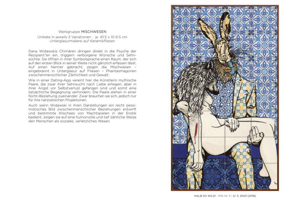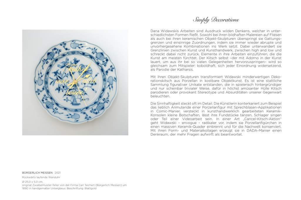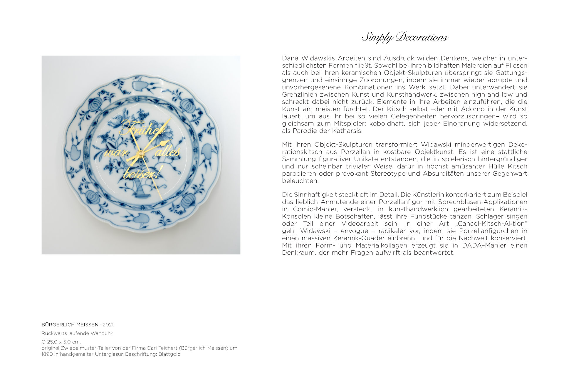 Dana Widawski (Jahrgang 1973), lebt und arbeitet in Berlin. Die Künstlerin studierte von 1995 bis 2000 Textildesign an der Burg Giebichenstein Hochschule für Kunst und Design in Halle/Saale (Diplom) und von 2004 bis 2006 Art in Context an der Universität der Künste in Berlin (Master of Arts). 2018 wurde Dana Widawski mit dem L102.ART PRIZE, 2011 mit dem Kunstpreis der Stadt Schwabach, 2001 mit dem Förderpreis der Wilhelm-Lorch-Stiftung und 2000 mit dem Förderstipendium der HKD Burg Giebichenstein ausgezeichnet. Ihre Arbeiten wurden u.a. ausgestellt in: Galerie Art Mûr Montréal (CA)/ Berlin; Galerie Antonella Cattani, Bolzano (IT); VI Kunstfestival Bydgoszczcz (PL); O19/ O23 | OSTRALE Biennale, Dresden; Kunstquartier Bethanien, Berlin; Galerie Mutter Fourage, Berlin; Galerie Gilla Lörcher | Contemporary Art, Berlin; Stadtgalerie Schwabach, Bayern; Kulturstiftung der Spaarkasse Karlsruhe; Freies Museum Berlin; Higure 17-15 CAS, Tokio, (JA); danubeVIDEOARTfestival, Grein (AT).